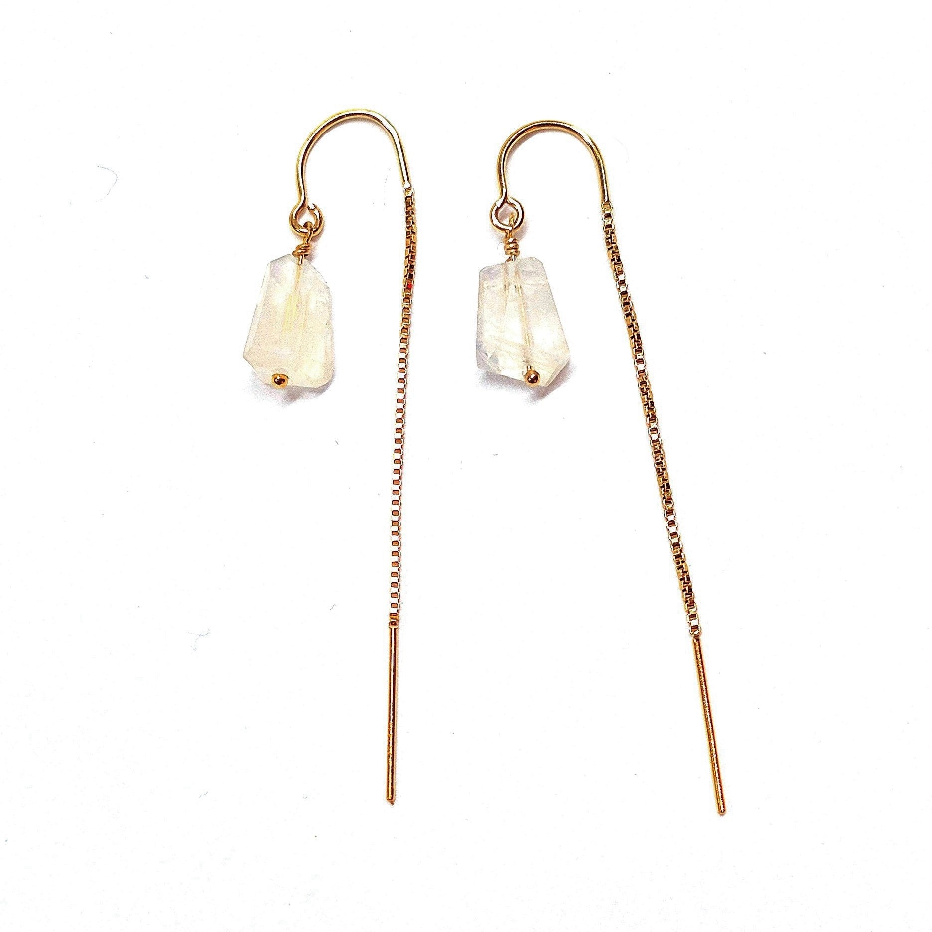 Genuine Moonstones adorned to hypoallergenic non-tarnish, dangling .6 inches from 14 K gold filled ear thread. Also available in pure Sterling Silver. Photos do not do justice to these glimmering moonstone gems.