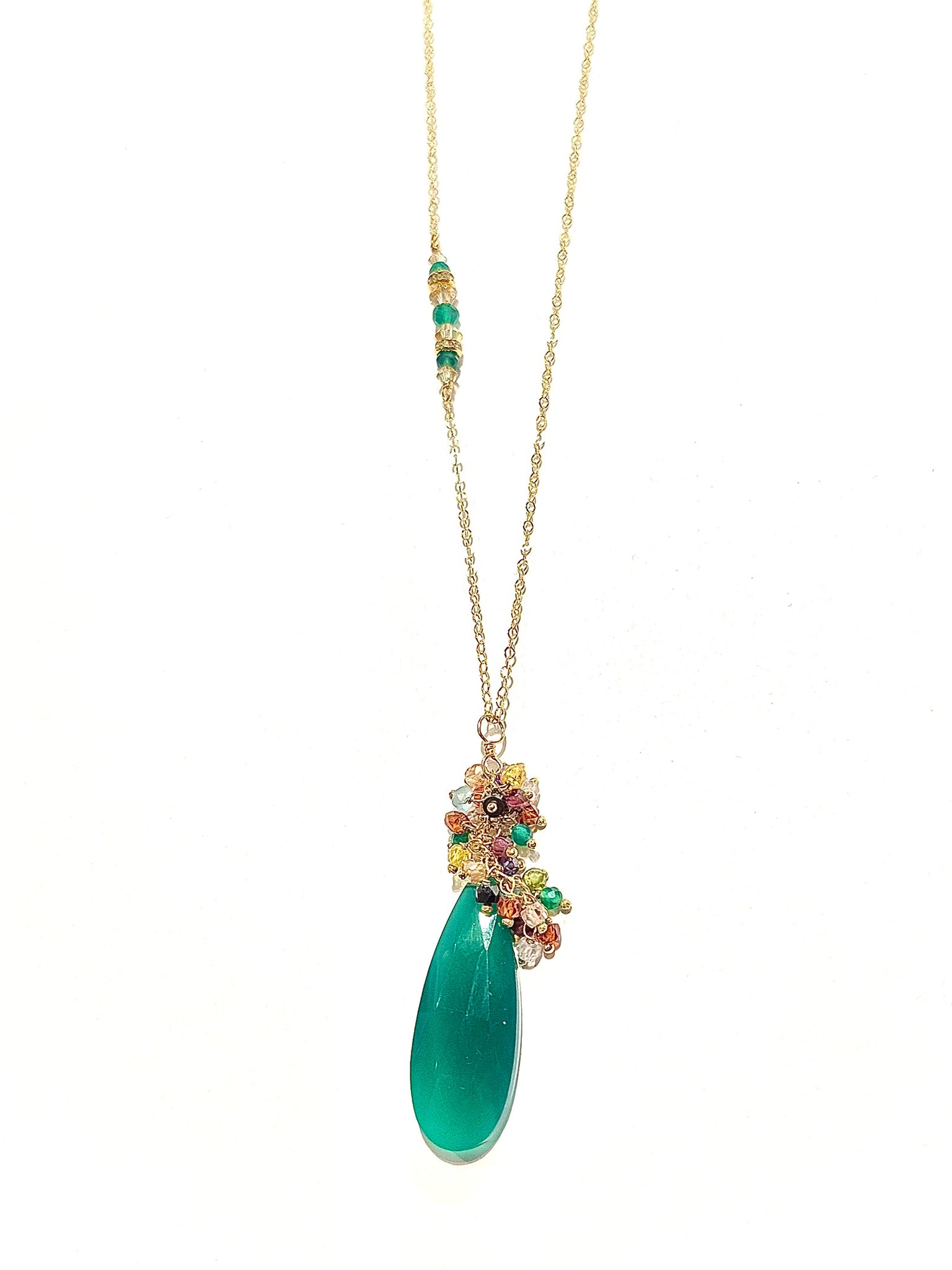 Dangles with easy movement from 14k gold fill or sterling silver. Extremely high quality chain and clasp with all closed jump rings. Side detail makes the necklace absolutely amazing, green Swarovski crystals.