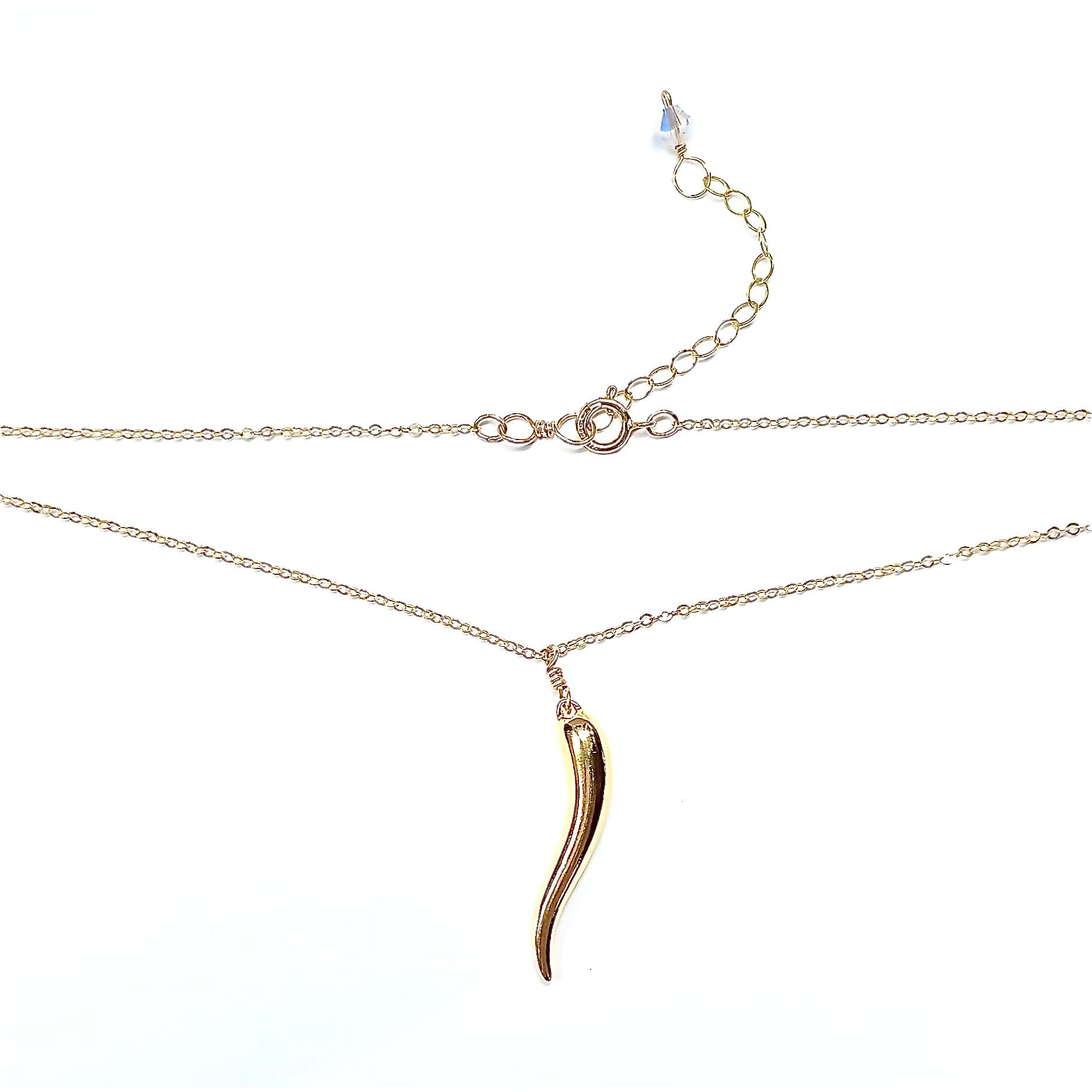 The 14k gold plated Italian Horn charm has a very nice weight to it and dangles delicately from 14K gold filled delicate chain and 14K gold filled clasp.