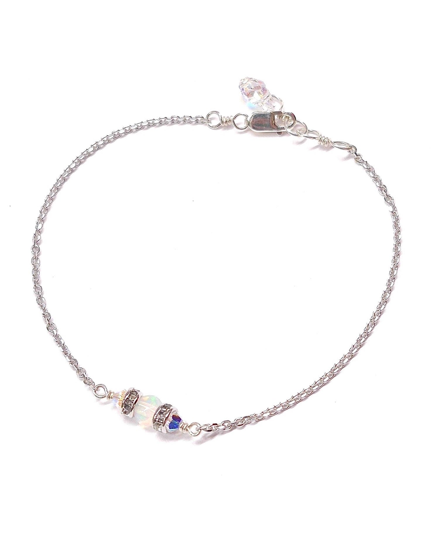 A single Ethiopian Opal adorned with Swarovski crystals and rhinestones is secured to pure dainty chain with adjustable clasp. A single clear Swarovski briolette Crystal dangles from the wrist.