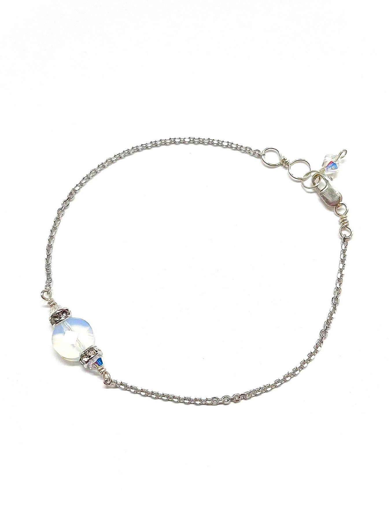 A single opalite adorned with Swarovski crystals and rhinestones is secured to pure dainty cable chain with adjustable clasp. A single clear Swarovski briolette Crystal dangles from the wrist.