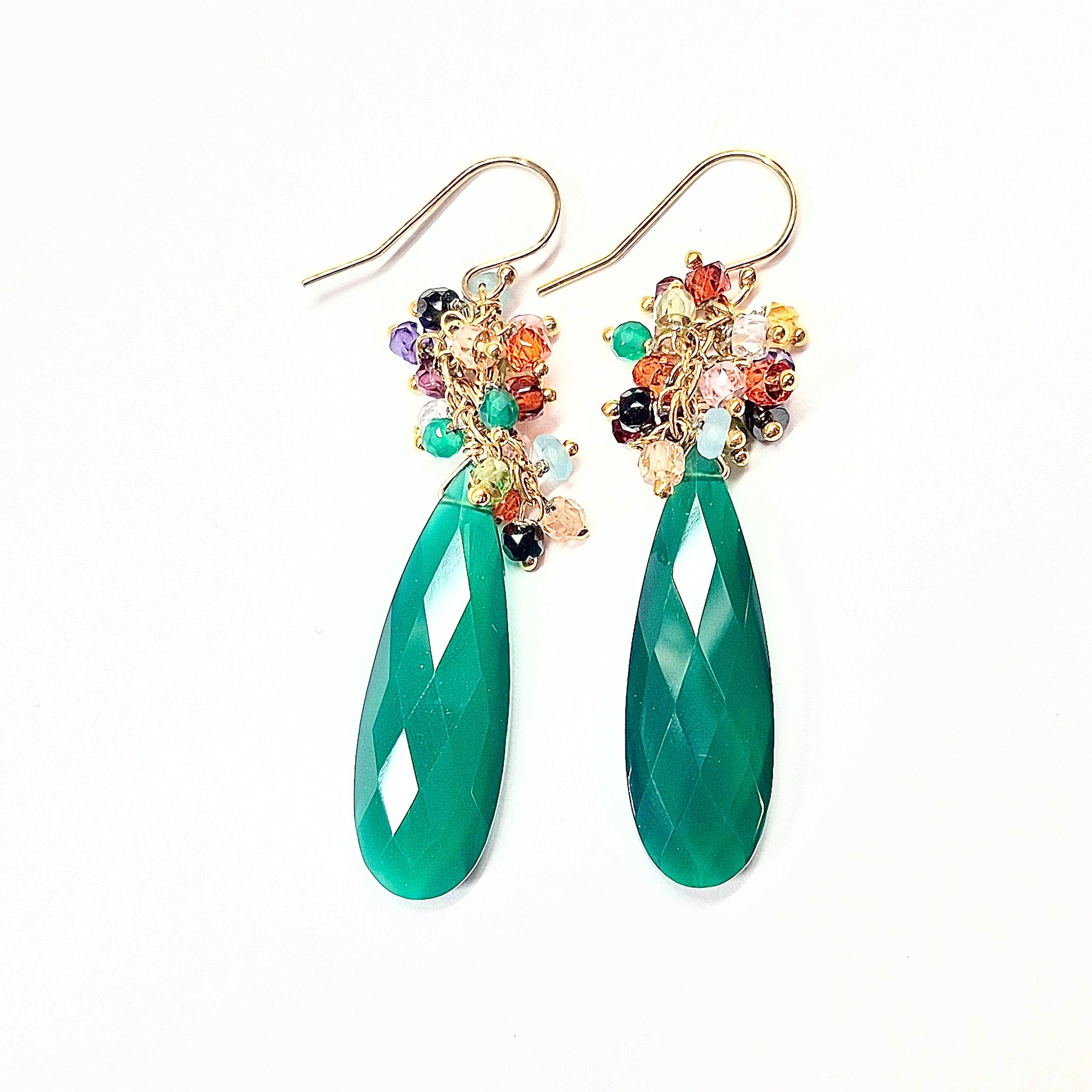 A faceted rare semi-precious green onyx or aventurine gemstone drop adorned with mini semi-precious stones dangles from 14k gold-filled ear wire.