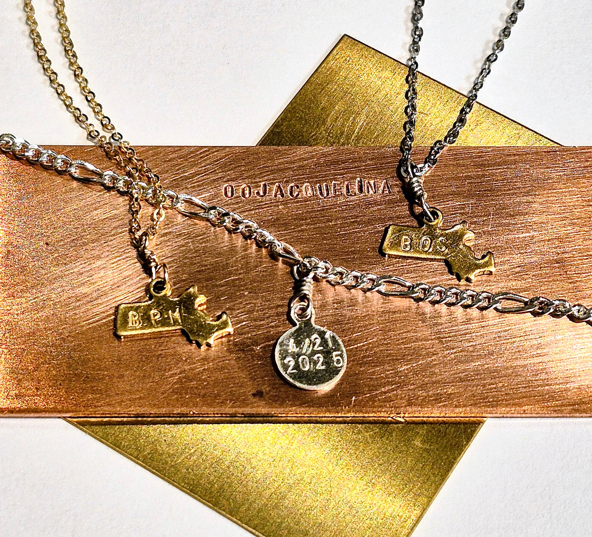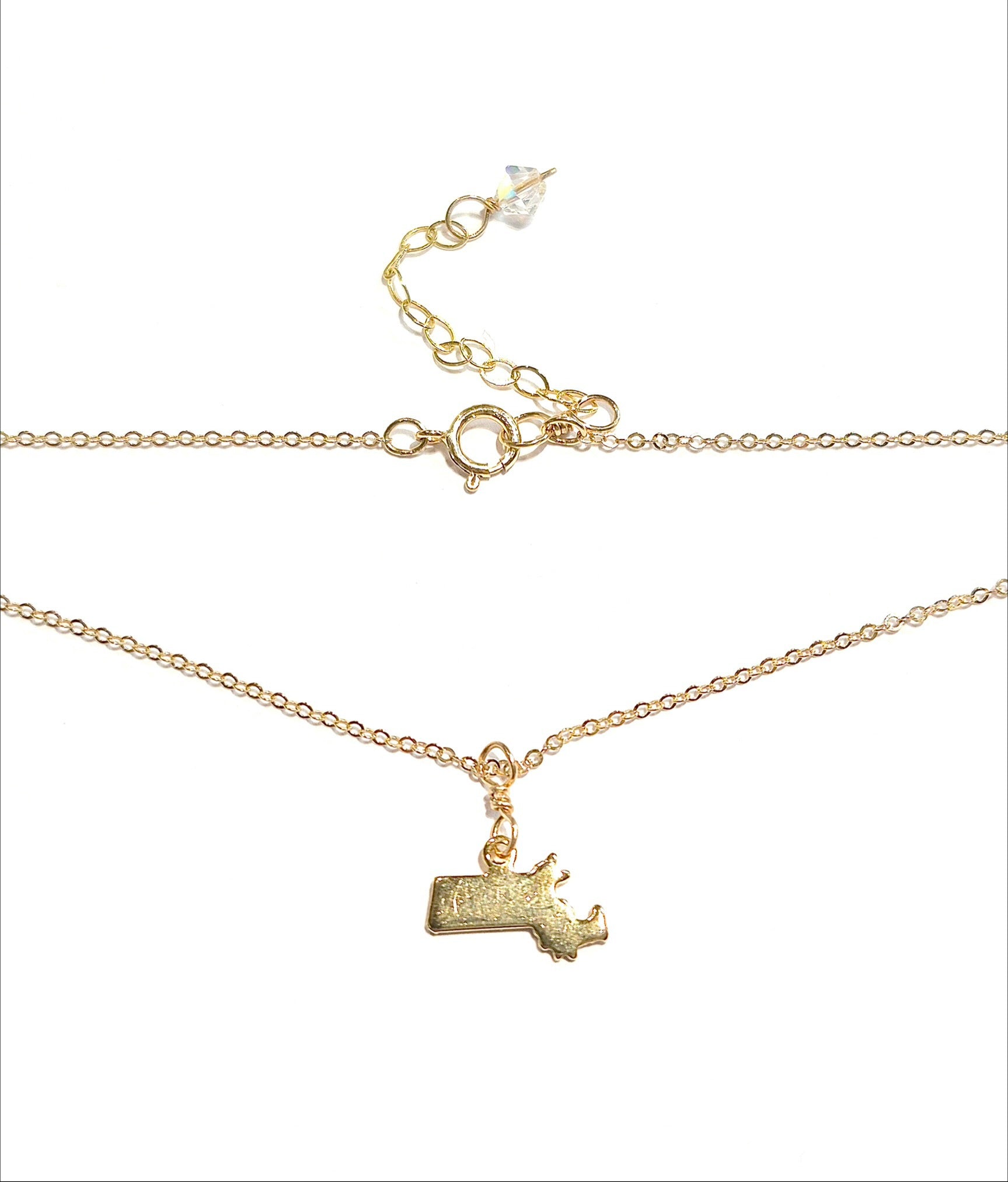 Gold plated brass Massachusetts state charm on 14K gold filled or Sterling silver chain.