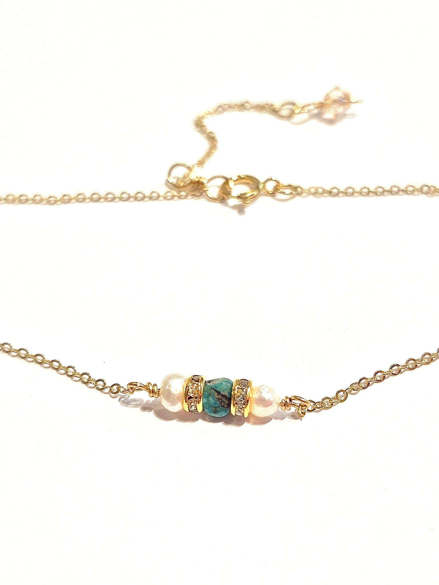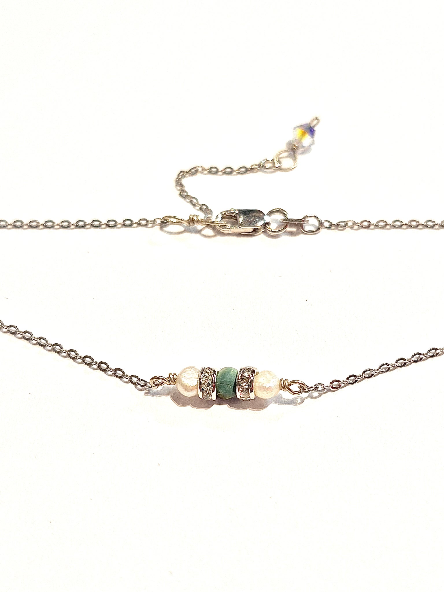 Genuine Turquoise faceted gemstone and freshwater pearls and rhinestone rondelles available in Sterling silver, or 14k gold fill chain. 14" w 2" adjustable clasp with Swarovski crystal in the back.